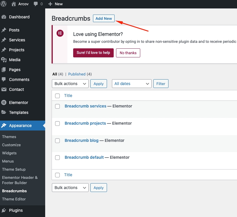 Step 1 - Go to WordPress Dashboard > Appearance > Breadcrumb > Add New