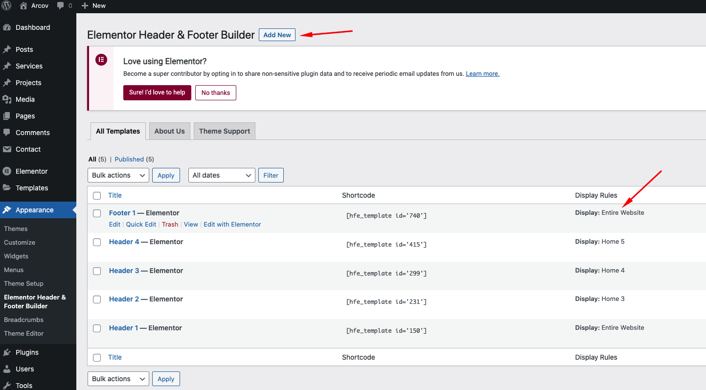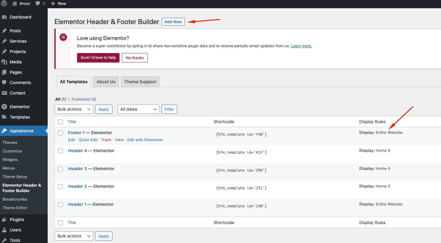 Go to WordPress Dashboard > Appearance > Header & Footer Builder > Add new > Edit with Elementor