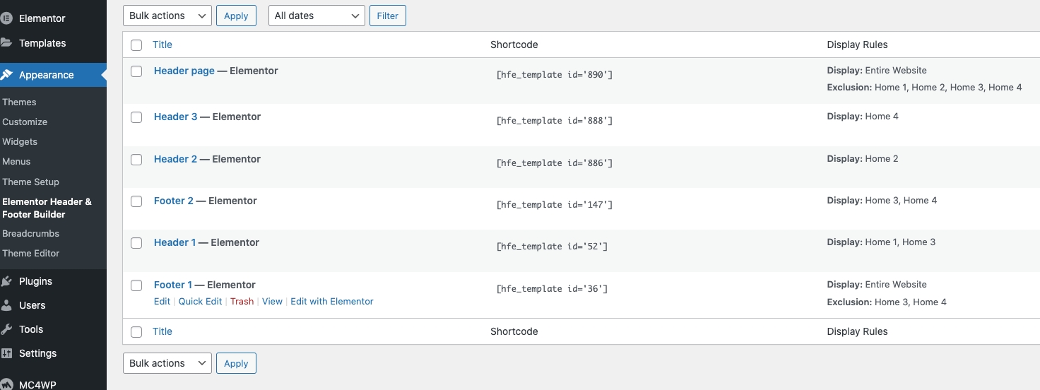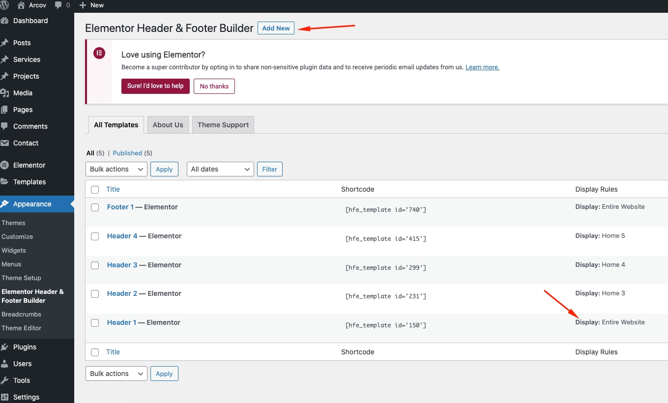 Step 1: Go to WordPress Dashboard > Appearance > Header & Footer Builder > Add new > Edit with Elementor
