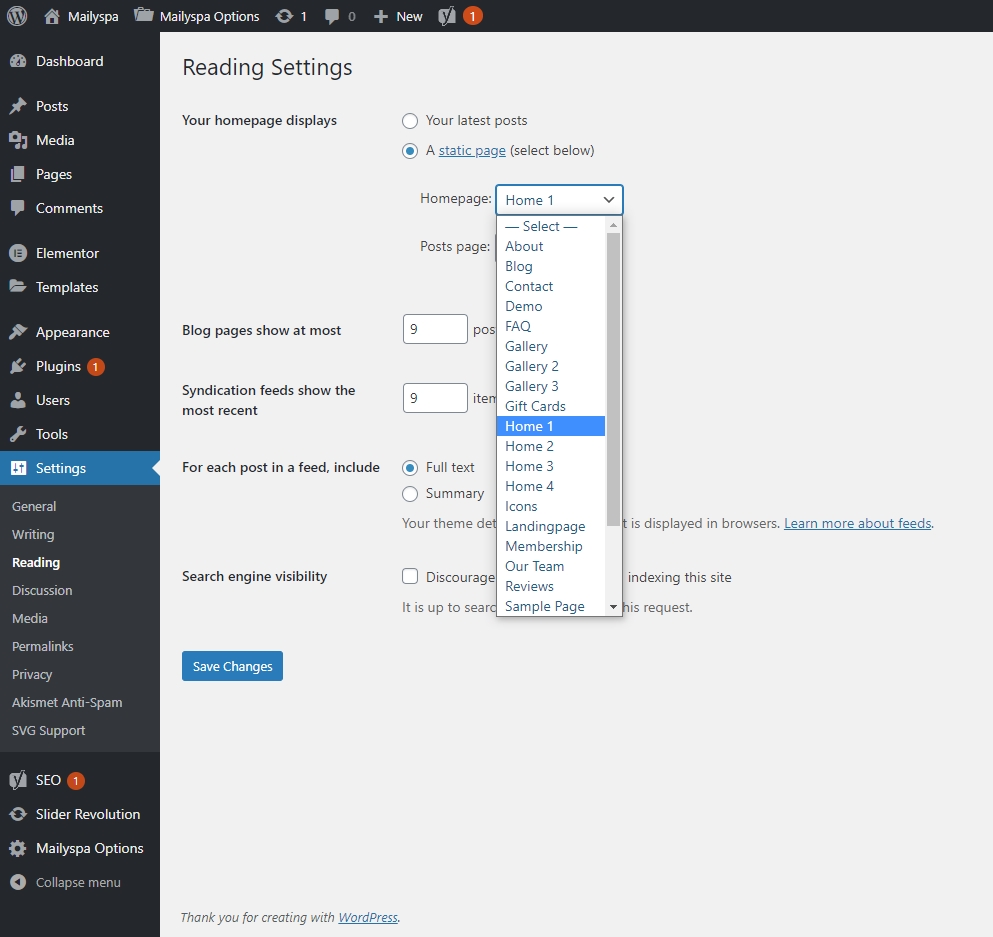 Step 3 - In the drop down menu for "Front Page" choose a page which will be your home page.