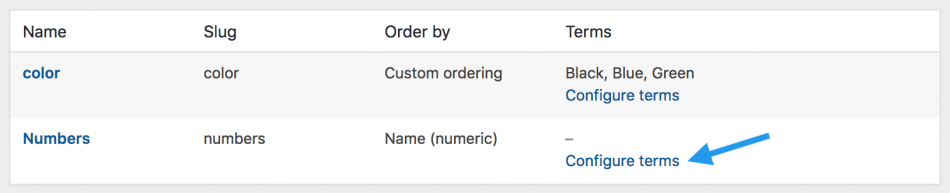 http://yourstore.com/pa_color/black/to your menu to only display black clothing –pastands for “product attribute.”Select a Default sort order. Choose between “Name”, “Name (numeric)”, “Term ID” or “Custom ordering” where you decide by dragging and dropping the terms in the list when configuring the terms (see below). “Name (numeric)” is relevant if the values are numbers. If you select “Name”, it sorts alphabetically with 1 and 10 preceding 2. If you select “Name (numeric)” it sorts based on numerical value.