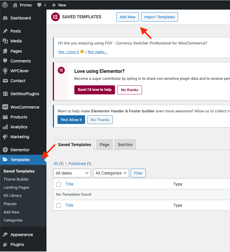Step 1 - From the admin Dashboard, navigate to Templates.