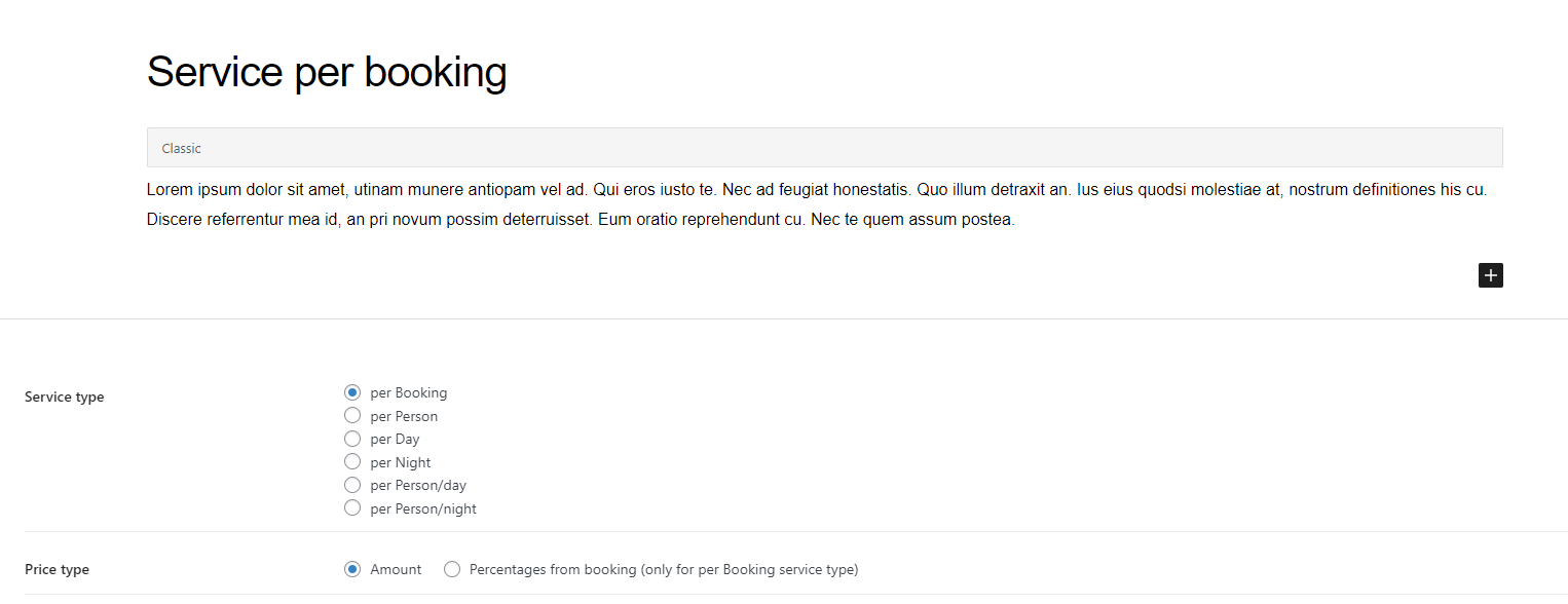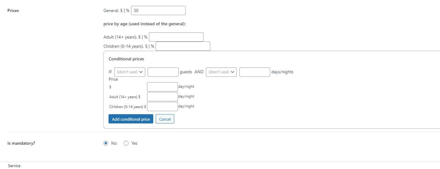 The booking rules differ depending on the business. For example, you have to set basic booking period on “1 day” for car rental, “1 night” for apartments, or “recurrent custom” for tours. Use booking mode option to define what you rent: whole “object” like rooms, apartments or cars, “places” in hostel or “tickets” for tours. Note, that age categories for prices will not used with “object” booking mode.