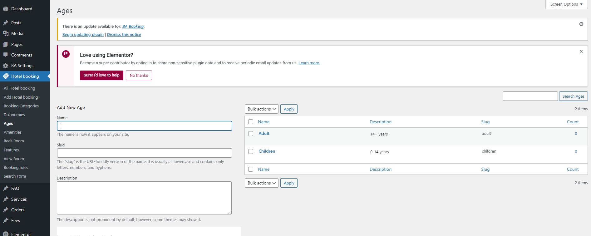 If you want to set prices based on the age of the customers, you have to add all ages as terms in the Ages taxonomy. Note, that “order” meta field is required. It defines the main age for basic price calculation. With the smallest number will be the main age (usually – adult), others will be sorted by ASC.