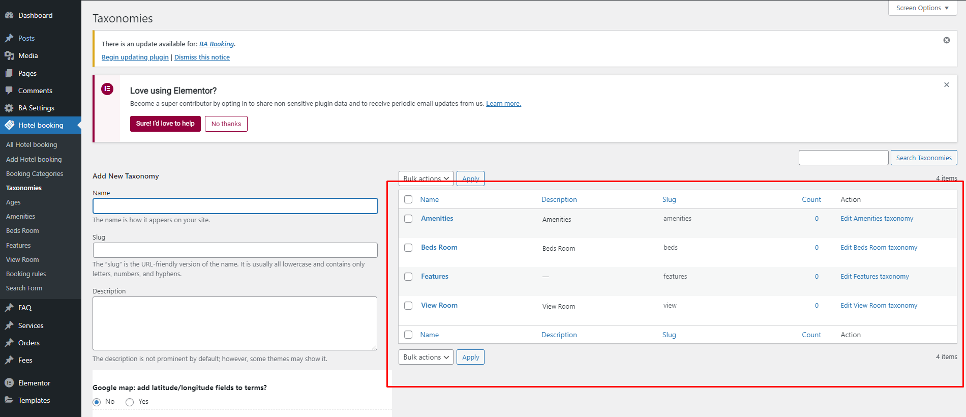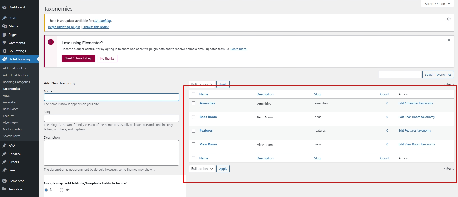 The basic post configurations are created as terms in “Categories” taxonomy for use as templates in our booking objects. You should define here booking rule, taxes, additional services, questions & answers, other taxonomies, step by step description and Google map integration. You could create as many categories as you need.