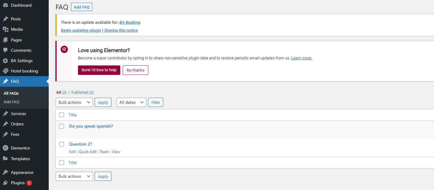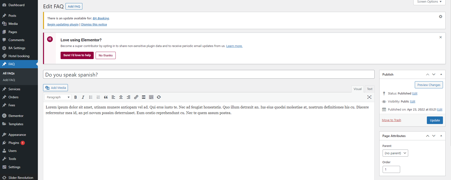The plugin allows you to add Questions & Answers to your booking object page in a simple way, by creating FAQ posts and selecting them when editing a booking object post.