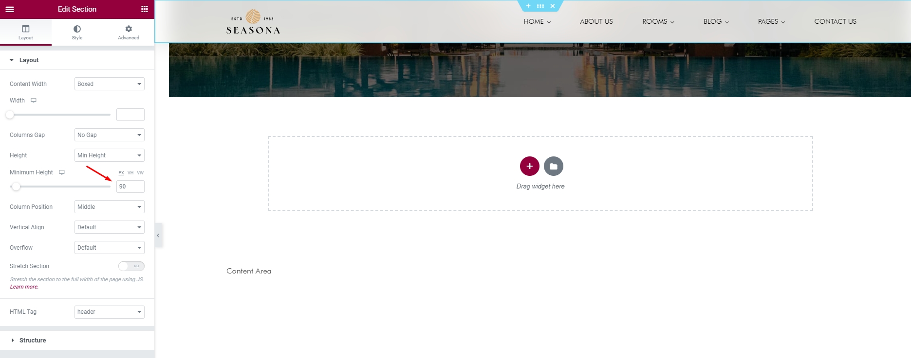 Also in the Layout tab, set the header’s Minimum Height equal to 90px: