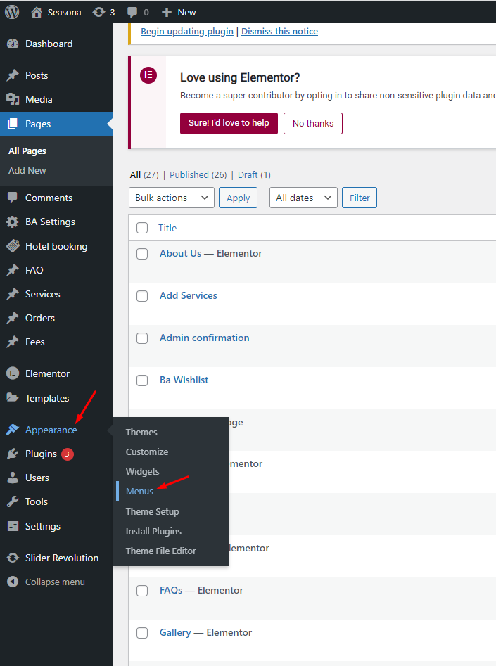 Step 2- From the 'Appearance' menu on the left-hand side of the Dashboard, select the 'Menus' option to bring up the Menu Editor.