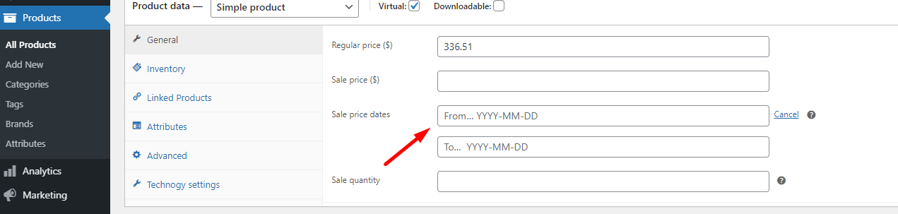Scroll down to the Product Data tab and right next to the Sale Price click on the Schedule link
