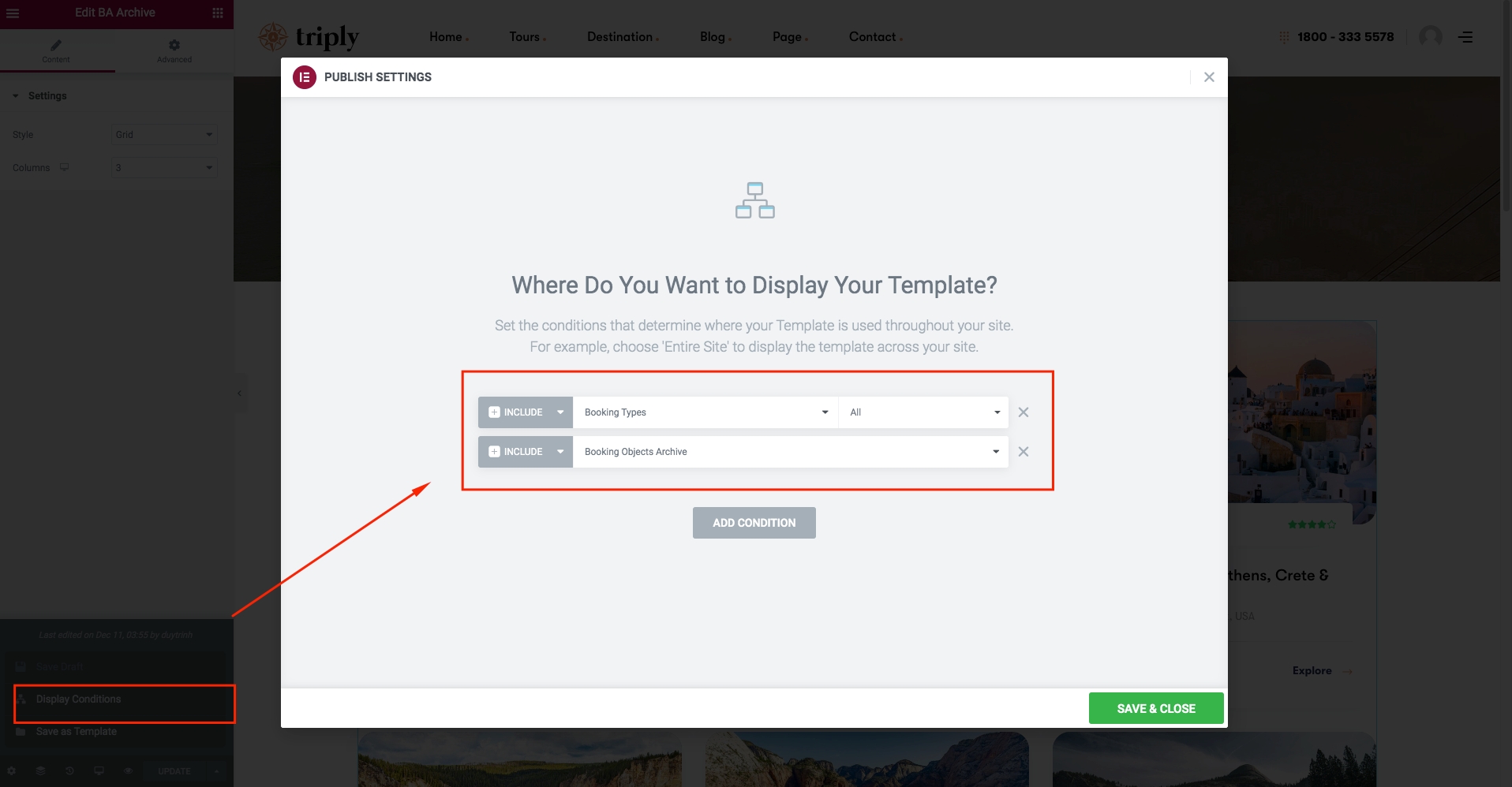 Then add Ba Archive Widget -> Save Template -> Display Conditions -> Select include Booking Types and Booking Objects Archive. -> Save and close