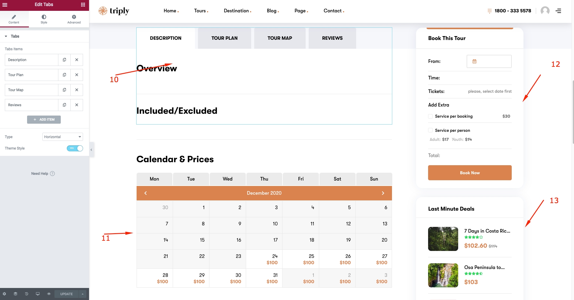 10. Tour tabs 11. Item calendar 12. Booking form 13. List items other