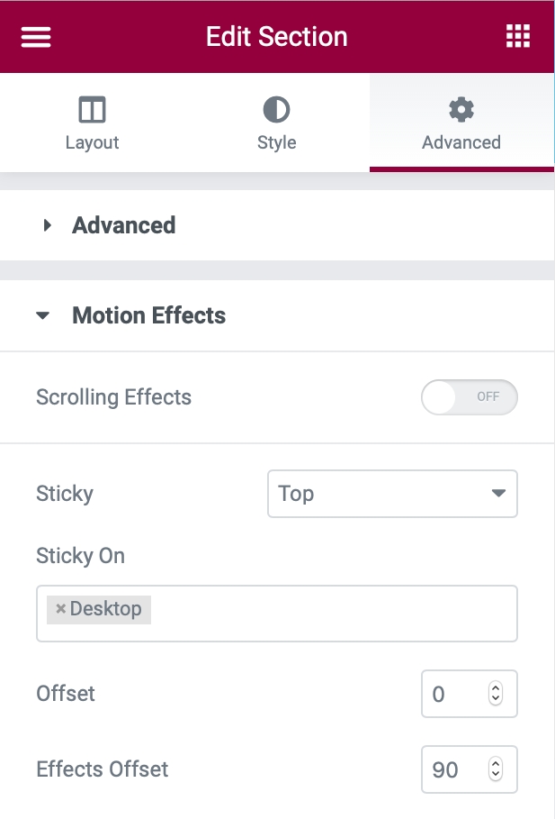 Open the settings for the section that contains your header. Then, go to the Advanced tab and open the Motion Effects settings:
