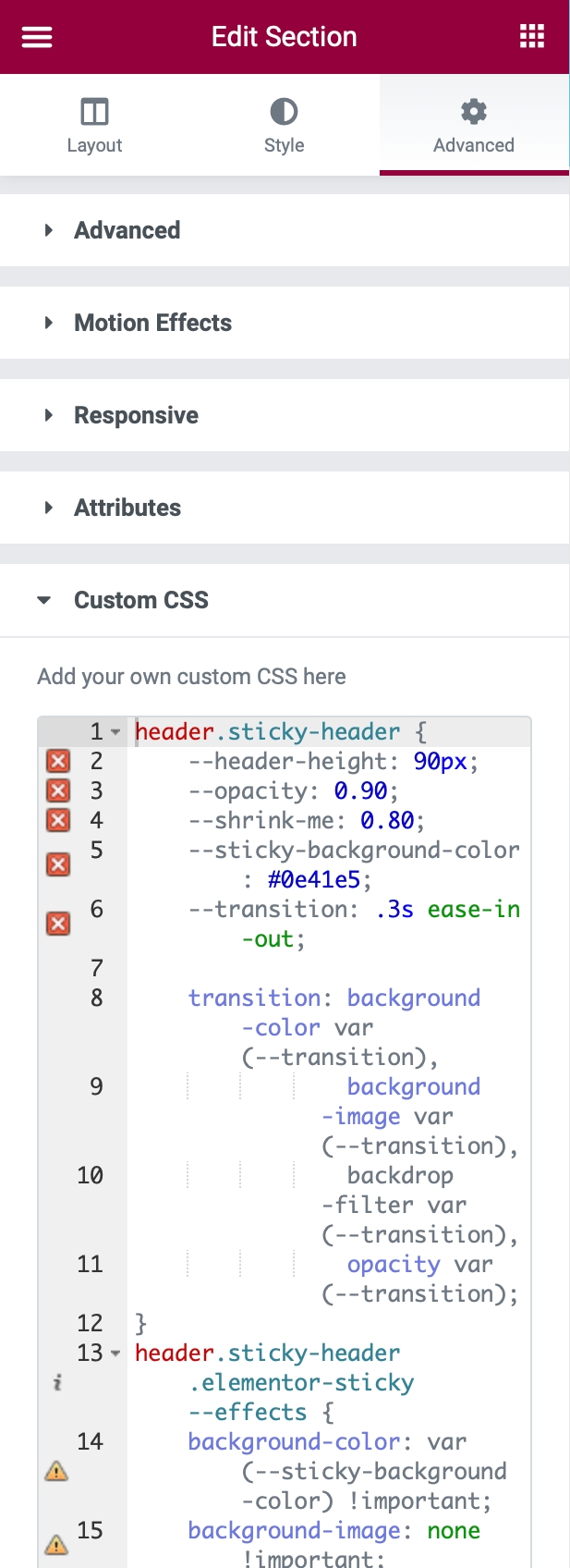 If you’re not using Elementor 2.9 yet, you can open the settings for the header section and go to Advanced → Custom CSS.