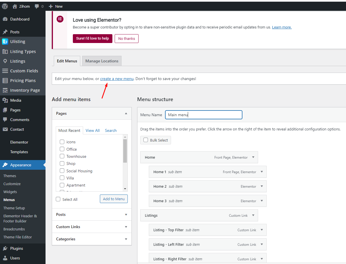 Step 3 - Select Create a new menu at the top of the page.