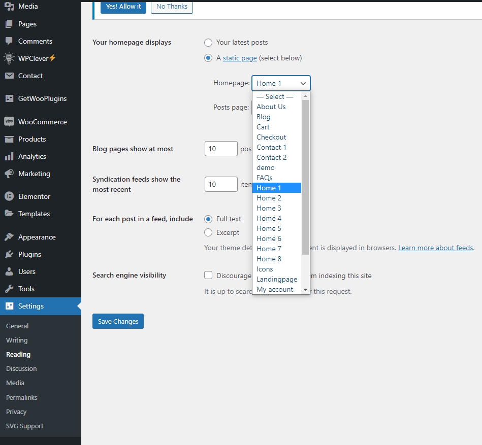 Step 3 - In the drop-down menu for "Front Page" choose a page that will be your home page.